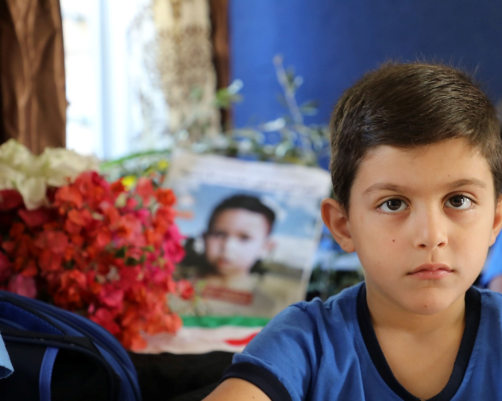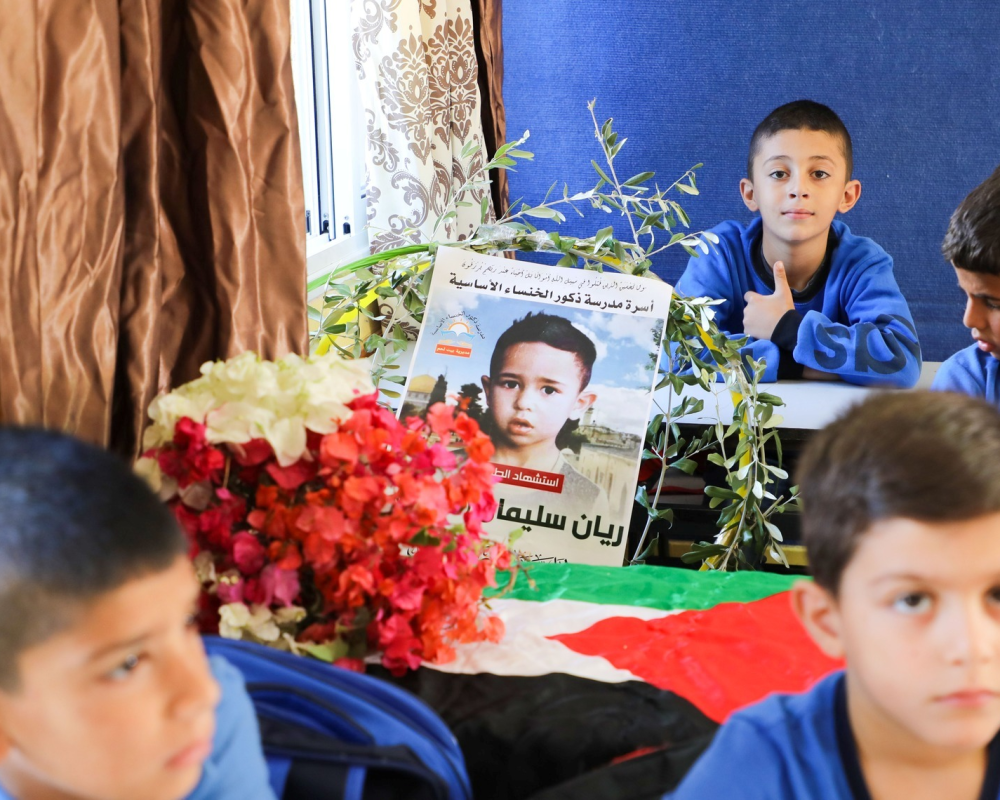 غاب جسد ريان عن مقعده الدراسي صباح اليوم لتحضر صورته وباقة من الورد والعلم الفلسطيني واغصان من الزيتون مكانه وجلس اقرانه في الصف الثاني الاساسي في هذه المدرسة وقد خيم الحزن والالم والوجوم على محياهم وسالة الدموع على وجناتهم جلسوا ومقاعدهم الدراسية فارغة من الكتب امامهم وهم يستذكرون زميلهم الذي غيبه جنود الاحتلال عنهم.