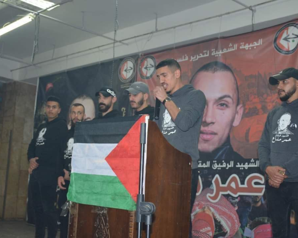 وخلال ذلك القى احد الملثمين كلمة الجبهة الشعبية قال فيها"أيها الأحرار، إنّ في عمقكم ثقافة الندّ والدفاع والعطاء والتضحية"، مؤكدًا على أنّ "الاحتلال لا يفهم إلّا لغة المقاومة التي جسدها رفاقنا الشهداء، وكان من بينهم المُقاتل الرفيق عمر مناع، الذي لقن الاحتلال درسًا في المواجهة من نقطة صفر مع جنود الاحتلال".