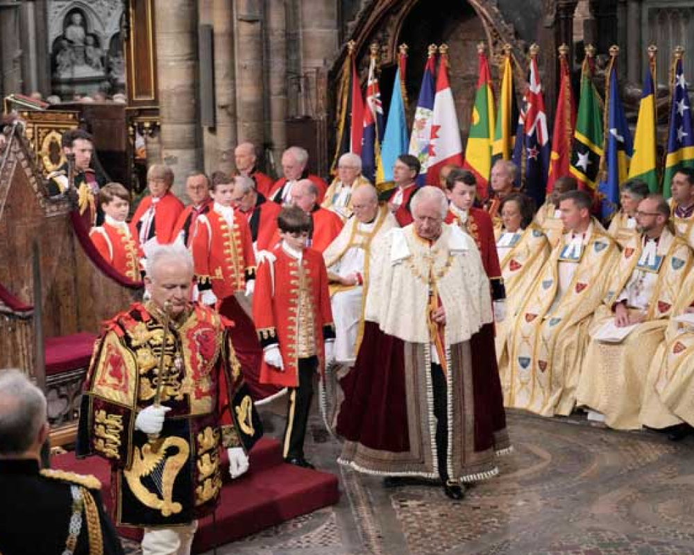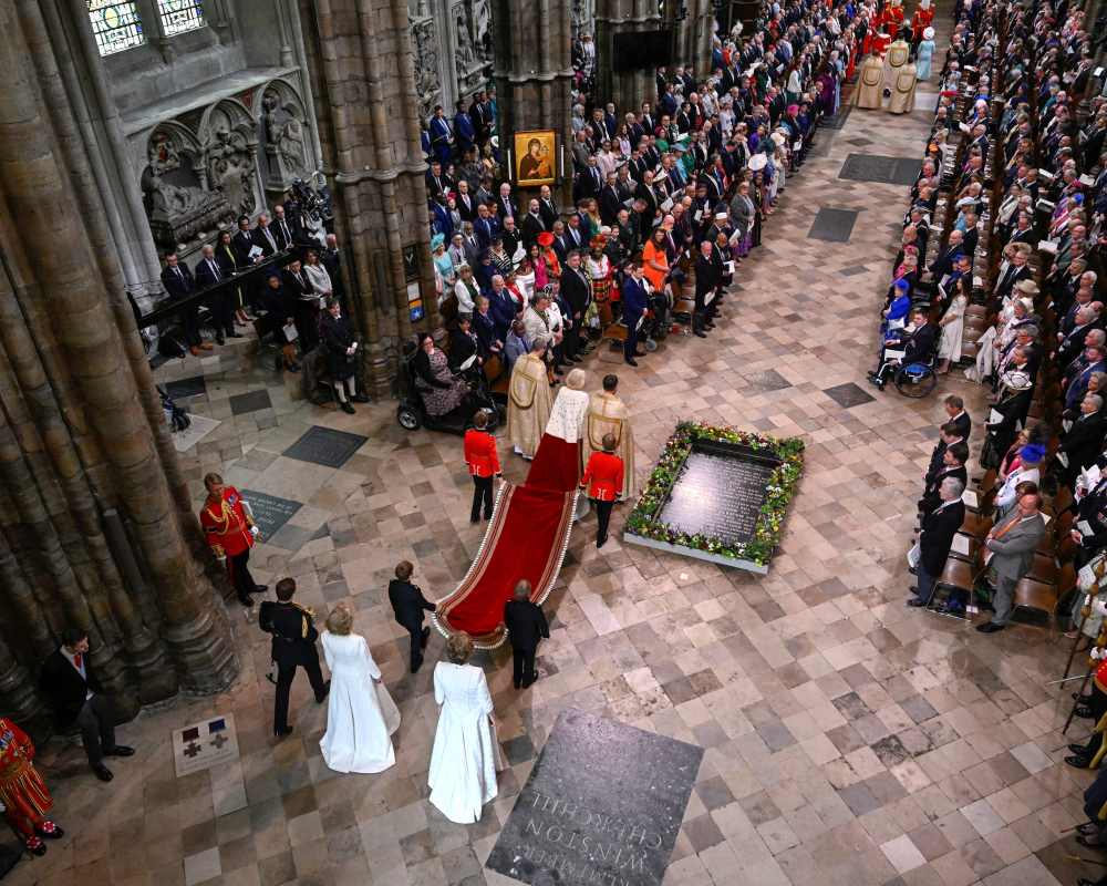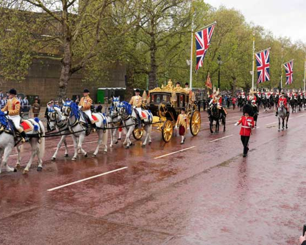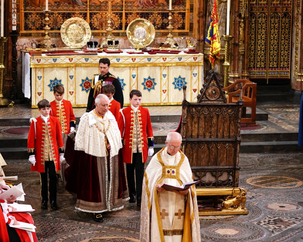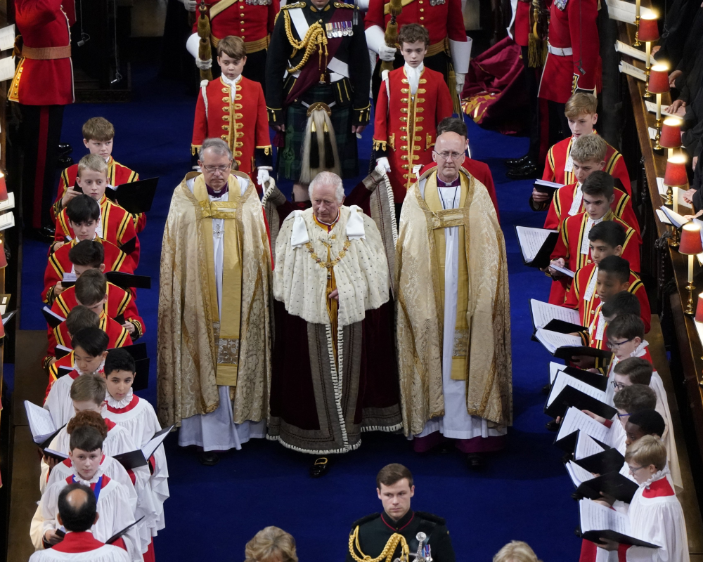 وبعد موكب رافق العربة التي أقلتهما تحت المطر من قصر باكنغهام، عبر الملك وزوجته بلباسهما الملكي، باب الكنيسة لتبدأ مراسم أنغليكانية لتتويجهما من قبل كبير أساقفة كانتربري.