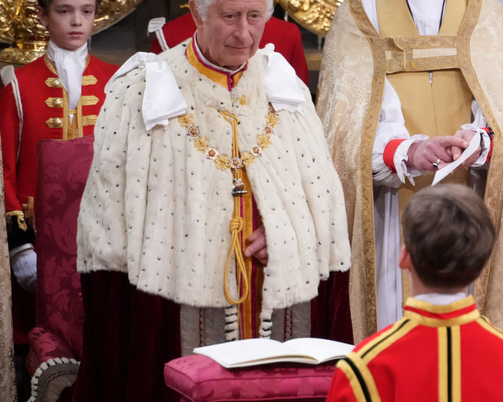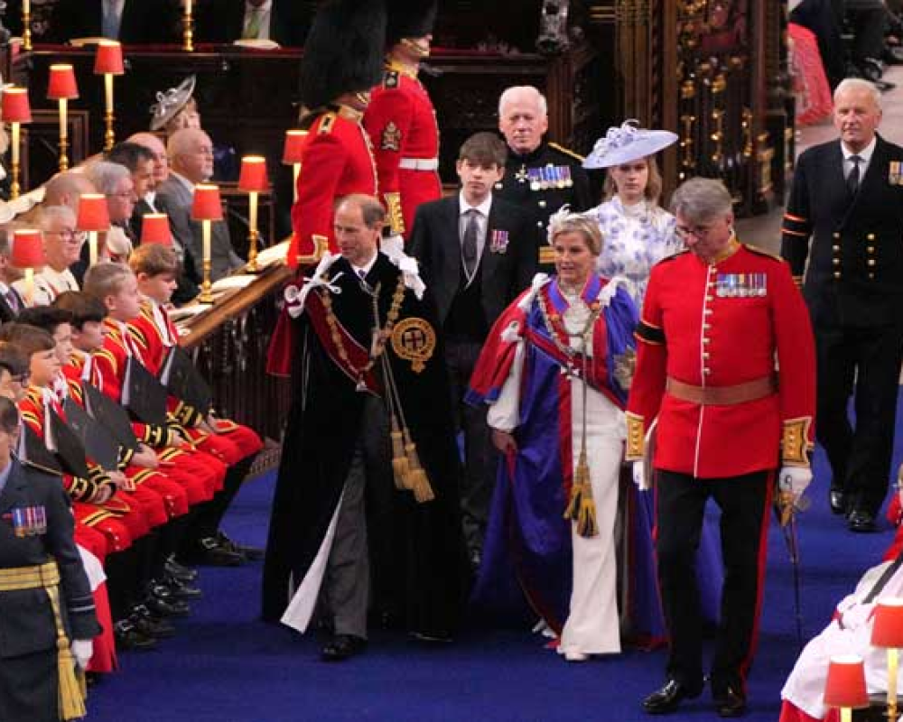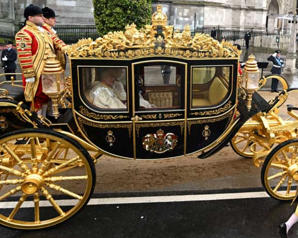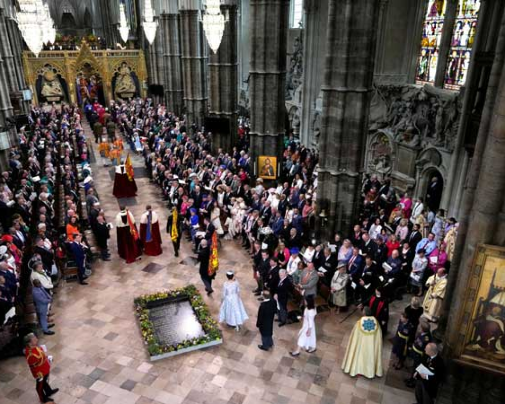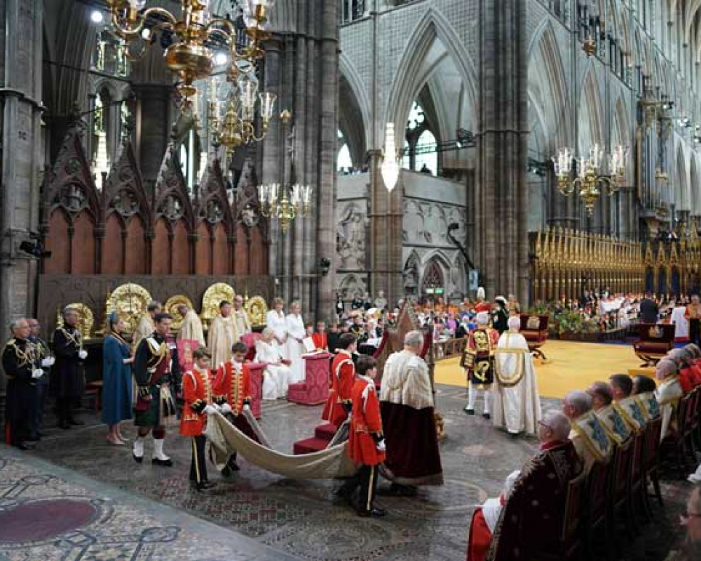 وبعد موكب رافق العربة التي أقلتهما تحت المطر من قصر باكنغهام، عبر الملك وزوجته بلباسهما الملكي، باب الكنيسة لتبدأ مراسم أنغليكانية لتتويجهما من قبل كبير أساقفة كانتربري.