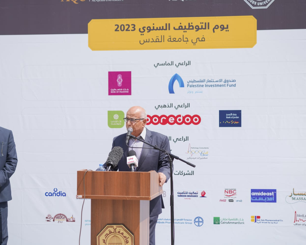 من جهته، افتتح النائب التنفيذي لرئيس جامعة القدس أ.د. حسن دويك الفعالية مرحبًا بالشركاء من المؤسسات المشاركة والرعاة ليوم التوظيف، قائلَا "نحن في فلسطين نعاني من فائض في عدد الخريجين على مستوى فلسطين، وفي جامعة القدس نسعى لإيجاد طالب مميز يتمتع بكل المهارات اللازمة لانخراطه في سوق العمل.. ونحن على ثقة بأن طلبتنا في مستوى التوقع المأمول منهم أمام التنافس الهائل بين خريجي الوطن عامة".