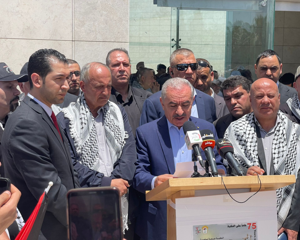 وتابع اشتية: "لأول مرة منذ عام 1948؛ ستحيي الأمم المتحدة اليوم ذكرى نكبة الشعب الفلسطيني بفعالية رسمية، في مقرها في نيويورك، بمشاركة الرئيس محمود عباس، الذي سيلقي خطابا، حول الظلم التاريخي الذي وقع على شعبنا وضرورة حماية حل الدولتين الذي يلقى إجماعا دوليا، ووقف التدمير الممنهج الذي تقوم به إسرائيل لتفتيت أرضنا وانتهاك مقدساتنا والتعدي على ثرواتنا وممتلكاتنا وترويع أهلنا وممارسة الاعتقال والقتل والإعدام لأولادنا".