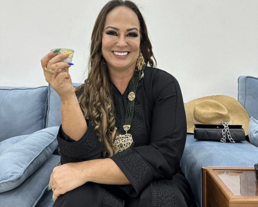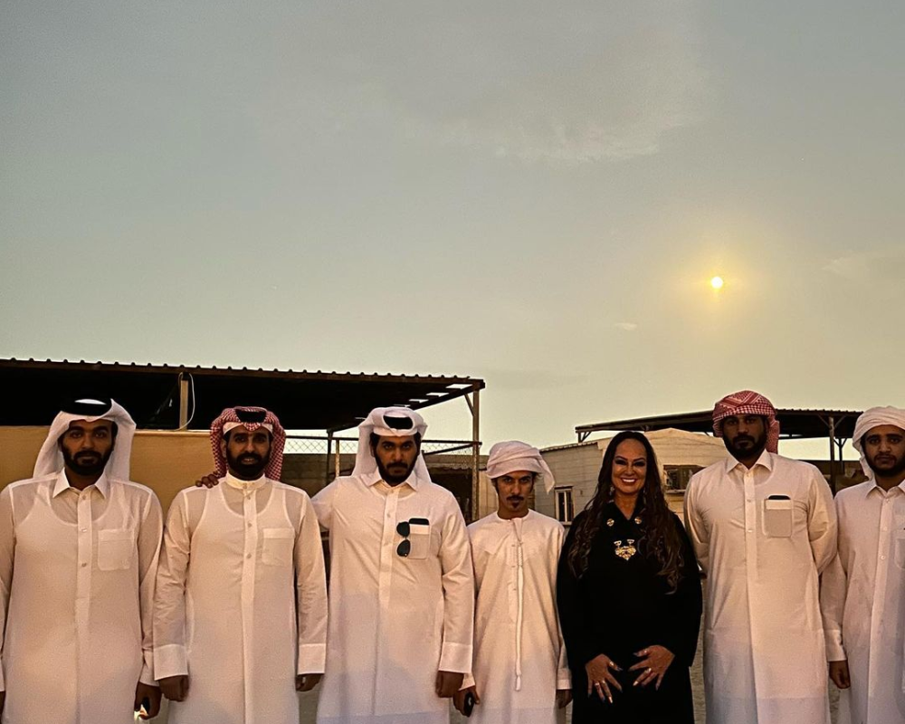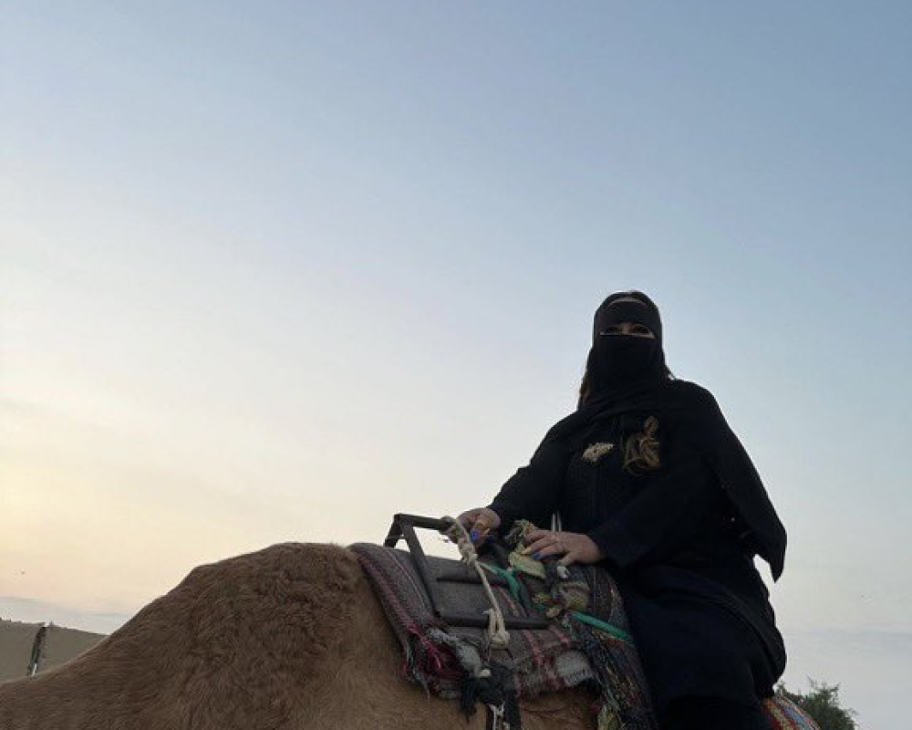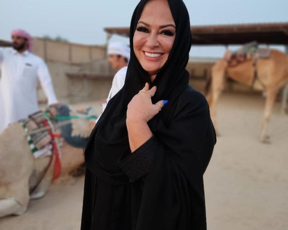كما ظهرت وهي تمتطي ناقة، وتلتقط صورا بجوار الإبل مع ابن نيمار "حفيدها" وسط الصحراء.