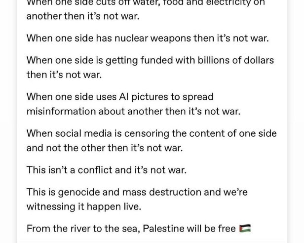 وقال الغازي في منشوره الداعم للفلسطينيين عبر حسابه على "إنستغرام": "إنها ليست حربا. عندما يقوم طرف بقطع المياه والغذاء والكهرباء عن طرف آخر، فهذه ليست حربا. عندما يملك طرف أسلحة نووية، فهذه ليست حربا".