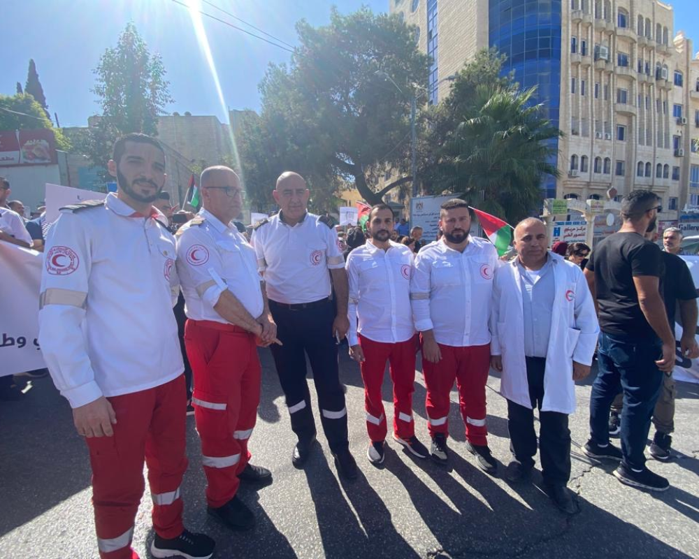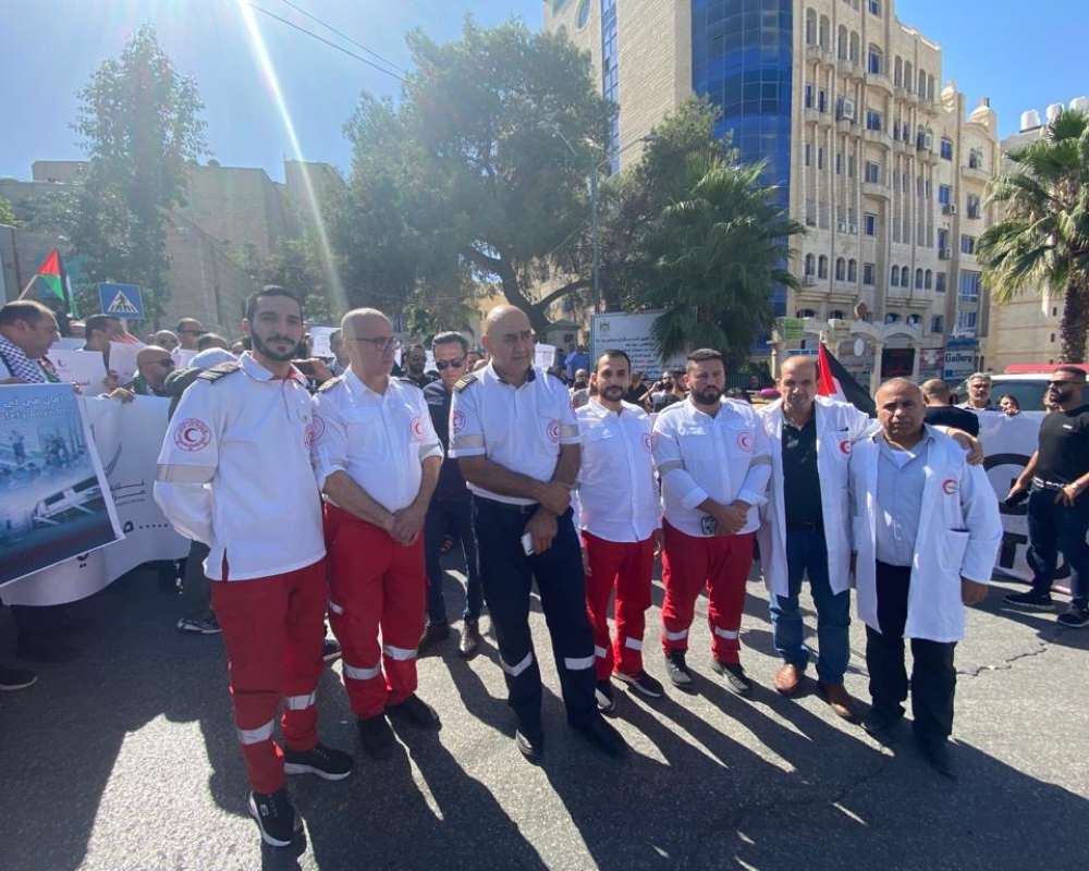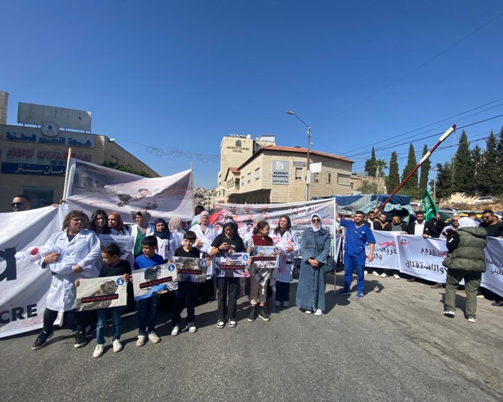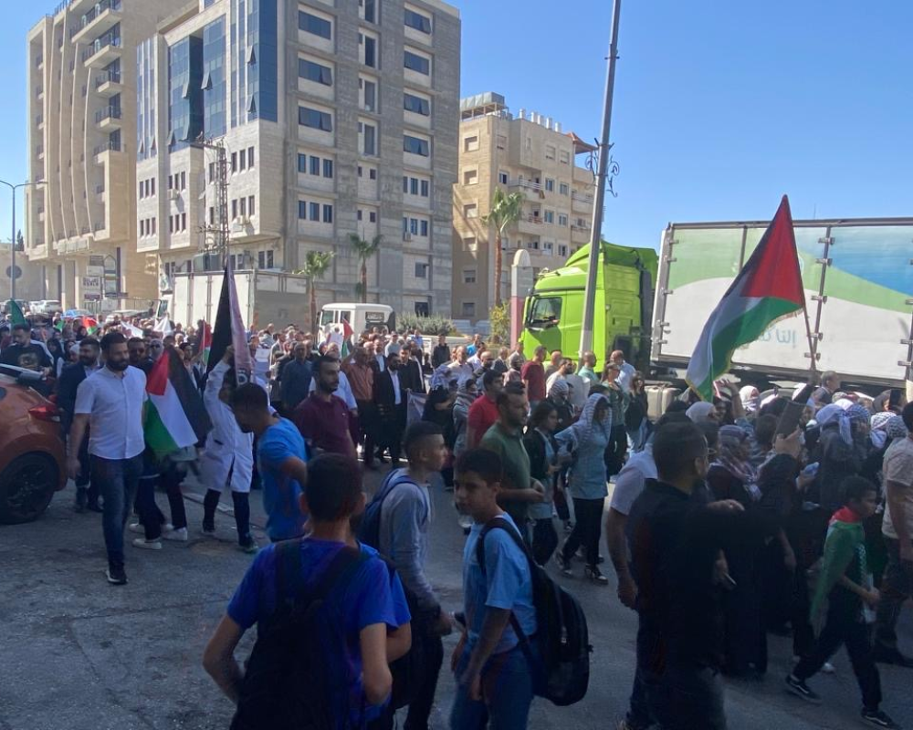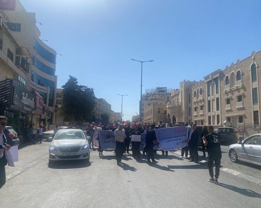 وانطلقت المسيرة الجماهيرية التي شارك فيها تجمع النقابات المهنية "13 نقابة مهنية في المحافظة، من امام مستشفى بيت جالا الحكومي، باتجاه المدخل الشمالي للمدينة، ورفع المشاركون فيها الاعلام الفلسطينية، وشعارات التنديد بجرائم الاحتلال الإسرائيلي في قطاع غزة، وجرائم إدارة سجون الاحتلال بحق أسري الشعب الفلسطيني.
