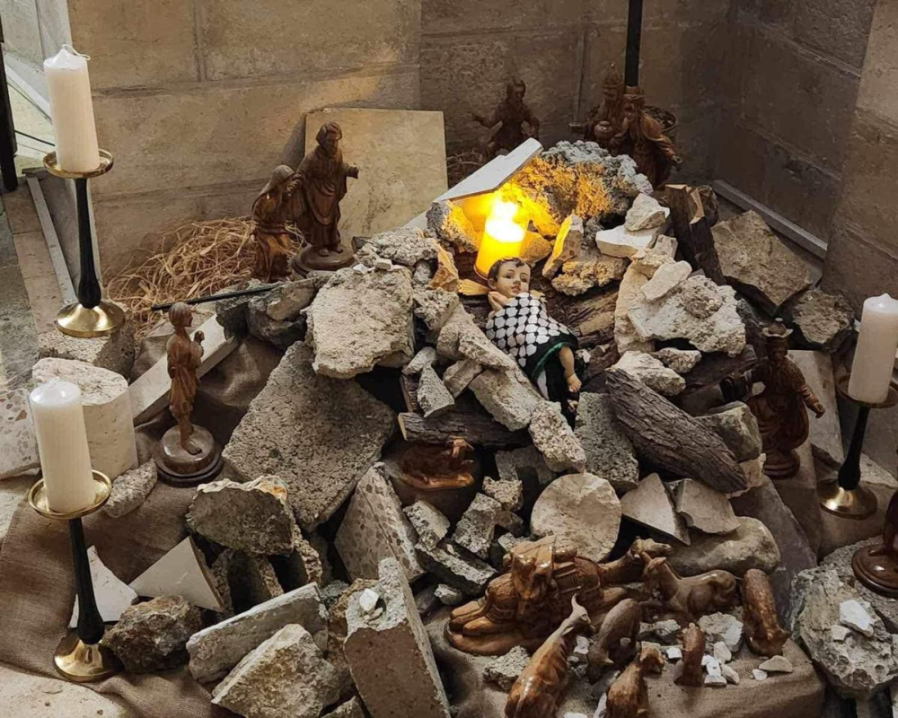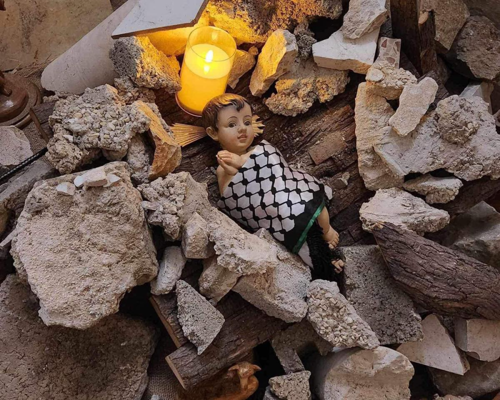 بيت لحم/PNN- تعبيراً عن وحدة الحال بين بيت لحم وغزة في ظل ما تواجهه فلسطين من عدوان وبعد أن اعلنت الكنائس الغاء كل المظاهر الاحتفالية بعيد الميلاد المجيد واقتصارها على الشعائر الدينية، اطلقت الكنيسة مراسم عيد الميلاد بزينة خاصة تتناسب مع واقع الحال الصعب في غزة التي تعرضت مساجدها وكنائسها للهدم والقصف والقتل حيث تضمنت الزينة وضع مجسم لإطفال فلسطينين تحت الركام في رسالة للعالم.