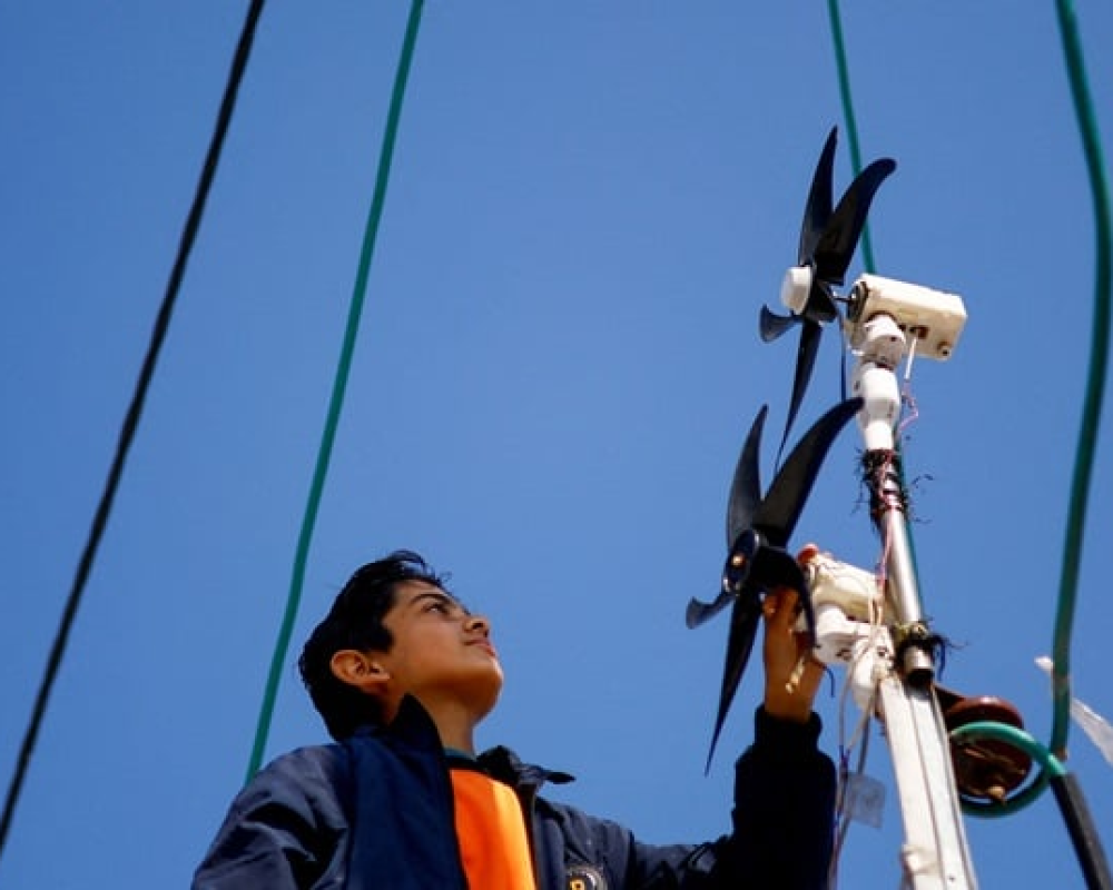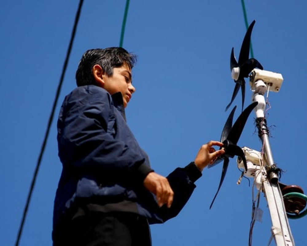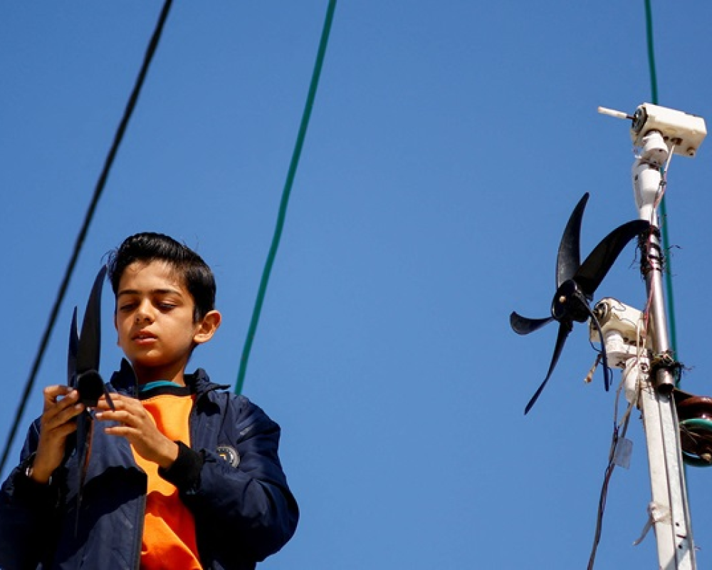 ونصبت عائلة العطار خيمتها بجانب منزل من طابق واحد، ما مكّنَ الصبي من الصعود إلى سطح المنزل وتركيب مروحتين فوق بعضهما لتعملا كتوربينيْ رياح صغيرين قادرين على شحن البطاريات.
