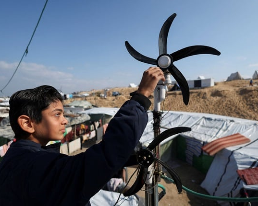 رفح/ PNN- أضاء الفتى الفلسطيني حسام العطار الخيمة التي يقيم فيها مع عائلته بعدما نزحوا نتيجة الحرب الإسرائيلية على غزة، مستخدماً مروحتين وجدهما في سوق للخردة وربطهما ببعض الأسلاك.