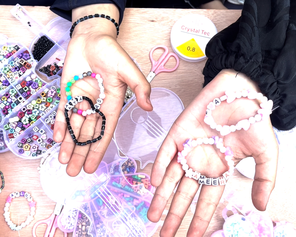 وحول فكرة المشروع تقول ديما انهم يقوموا بالجلوس على بسطة في السوق وانشاء اساور واكسسوارات بشكل مباشر لزبون حسب الاسم والعمر التي تتم بصناعة يدوية حيث جاءت الفكرة لهم بعد أشهر من جلوسهم في مكان نزوحهم وقاموا بتعلم انشاء الاكسسوارات من اجل العمل بها