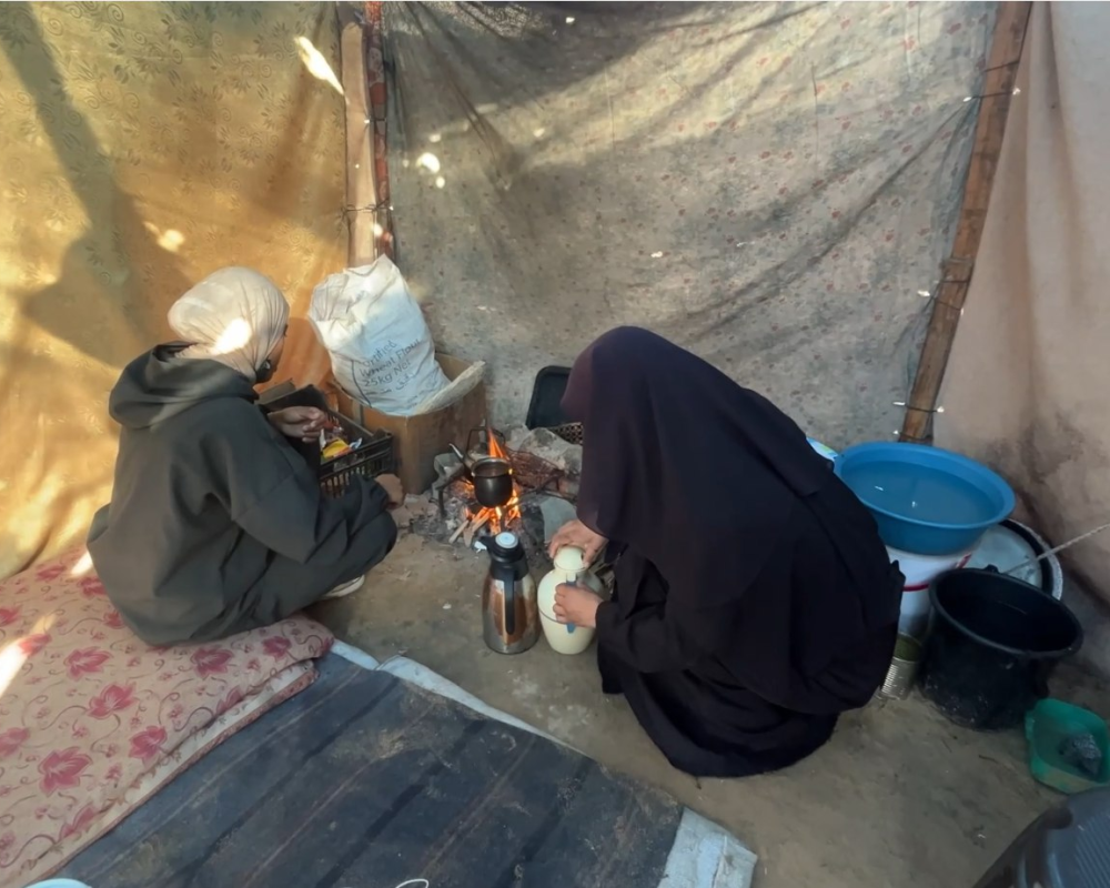 واوضحت انها و ابنتها اضطرتا أن تعملا في مجال طهي و توفير الشاي والقهوة حيث تقوم هي بطهيهما على النار وبعد ذلك يسلموها لنازحين يقوموا بدورهم ببيعها للمواطنين على شواطئ بحر غزة".