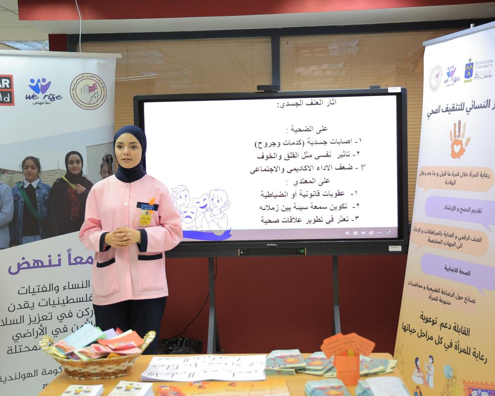 من جانبها بينت فاطمة المدني مديرة قسم القبالة في جامعة بيت لحم كلية التمريض والعلوم الصحية، أن هذه المبادرة جاءت إستكمال لتدريبات تلقتها الطالبات مع مركز الإرشاد النفسي والإجتماعي للمرأة في الفصل الماضي، وكان من مخرجات هذا التدريب ،مبادرات ناجحة قدمتها طالبات القبالة في جامعة بيت لحم ، وعنوان هذه المبادرة هو العنف الرقمي