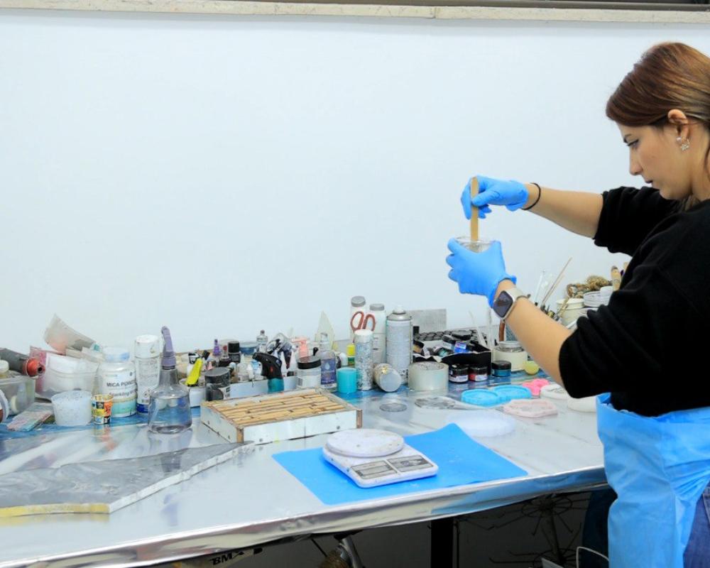 بدأت بلقيس بتجربة العمل في زاوية صغيرة من منزلها، حيث دمرت أكثر من 100 قطعة قبل أن تتمكن من إتقان الفن. تعلمت كيفية مزج مادة الريزن مع المجفف بنسب دقيقة وصبر طويل، فكل قطعة تأخذ وقتها، تتراوح من يومين إلى ثلاثة أيام أو حتى شهر في بعض الأحيان، بحسب تعقيد القطعة. ورغم الفشل المتكرر، لم تتوقف، بل أصرّت على متابعة العمل حتى أصبحت متمكنة، وبدأت تبتكر منتجات متنوعة مثل علاقات المفاتيح، وأدوات للسيارات، ولوحات فنية، حيث كانت تحفظ الأزهار داخل مادة الريزن لتبقى للأبد.
