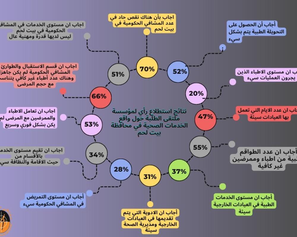 وجاء في الاستطلاع الذي نفذه ملتقى الطلبة ومجموعاته الشبابية وبشراكة إعلامية من شبكة فلسطين الإخبارية PNN، أن مستوى الخدمات الصحية المقدمة للمواطنين في محافظة بيت لحم بحاجة ماسة لتحسينه على أكثر من صعيد.