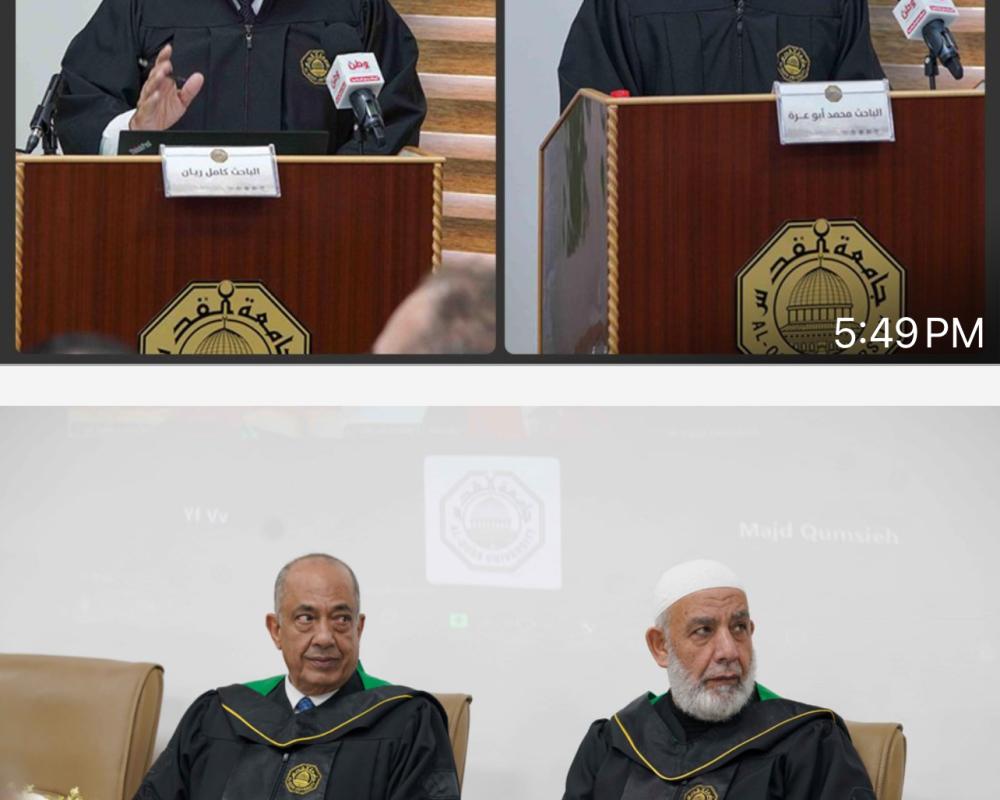 وجاءت أطروحة الطالب كامل ريان بعنوان "التكييف القانوني للوضع الرهن ستاتيكو للمسجد الأقصى وفق قواعد القانون الدولي العام"، وتكونت اللجنة من المشرف أ.د. سعيد أبو علي، والممتحن الخارجي الأول أ.د. حسن سند – جامعة المنيا- مصر، والممتحن الخارجي الثاني أ.د. عبد الله الهواري- جامعة المنصورة- مصر، والممتحن الخارجي الثالث د. ناجح بكيرات، والممتحن الداخلي أ.د. محمد الشلالدة.