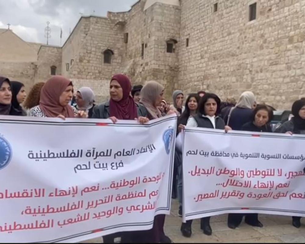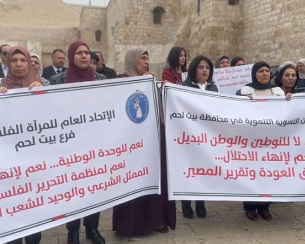 وقالت خولة الأزرق رئيسة اتحاد لجان المرأة للعمل الاجتماعي ان هذه الوقفة اليوم ان هذه الفعالية اليوم تتم بتنظيم من الاتحاد العام للمرأة الفلسطينية والمؤسسات النسوية بمحافظة بيت لحم من اجل رفع صوت النساء بمناسبة الثامن من اذار وهو يوم المرأة العالمي و الذي يرمز للعدالة والمساواة لكن هذا اليوم يمر هذا العام في ظل أوضاع صعبة على النساء الفلسطينيات اللواتي يتعرضن من اشكال القمع والقتل والاستهداف الذي وصل حد حرب الإبادة الجماعية.