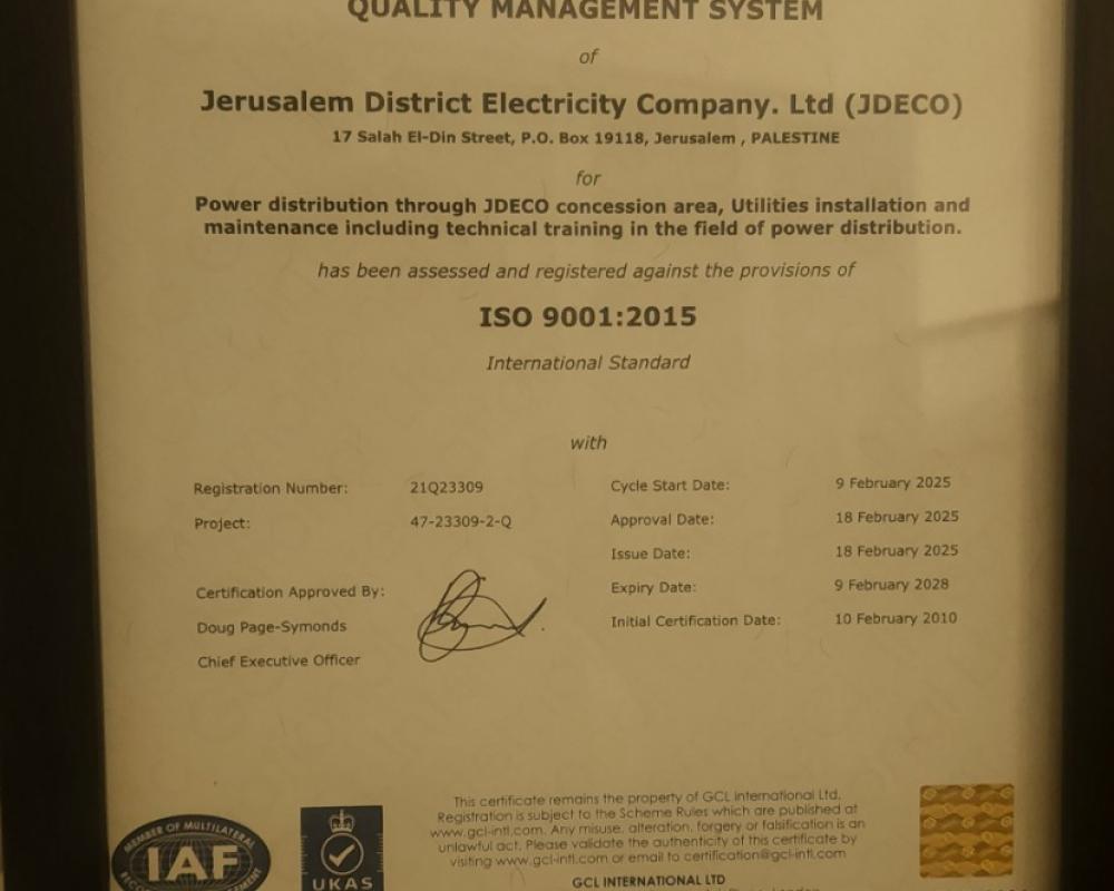 تجدر الإشارة إلى أن شركة كهرباء محافظة القدس قد حصلت على شهادة ISO 9001 لأول مرة عام 2010، وهي تعد من الشركات الرائدة في قطاع الطاقة الفلسطيني. منذ ذلك الحين، تواصل الشركة تطبيق نهج الجودة الشاملة، مستهدفةً تحقيق أعلى المعايير العالمية في تقديم الخدمات وتعزيز كفاءة .