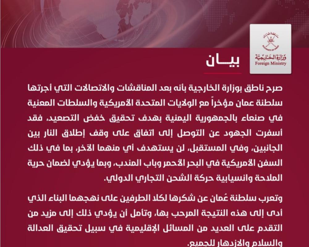 وذكر الناطق باسم وزارة الخارجية العُمانية، أنه "بعد المناقشات والاتصالات التي أجرتها سلطنة عمان مؤخرا مع الولايات المتحدة الأميركية والسلطات المعنية في صنعاء بالجمهورية اليمنية بهدف تحقيق خفض التصعيد، فقد أسفرت الجهود عن التوصل إلى اتفاق على وقف إطلاق النار بين الجانبين".
