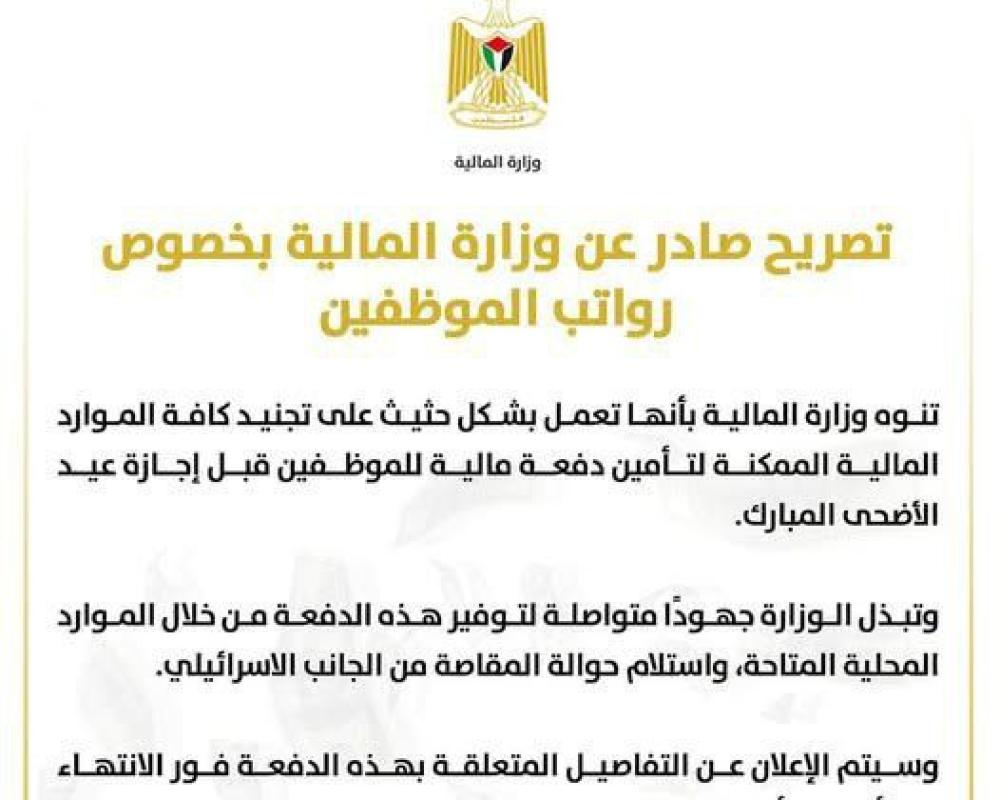 وأكدت الوزارة في بيان رسمي، أنها تبذل جهودًا متواصلة لتوفير هذه الدفعة من خلال الموارد المحلية المتاحة، واستلام حوالة المقاصة من الجانب الاسرائيلي.