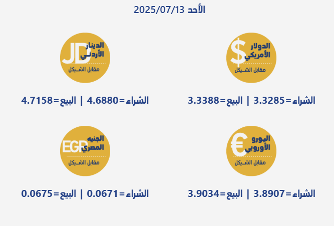 رام الله / PNN - جاءت أسعار صرف العملات مقابل الشيقل الإسرائيلي، اليوم الأحد، بحسب سلطة النقد الفلسطينية، على النحو التالي: