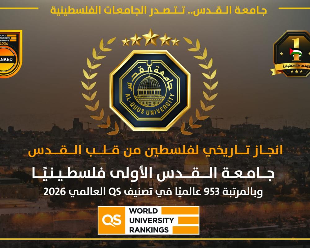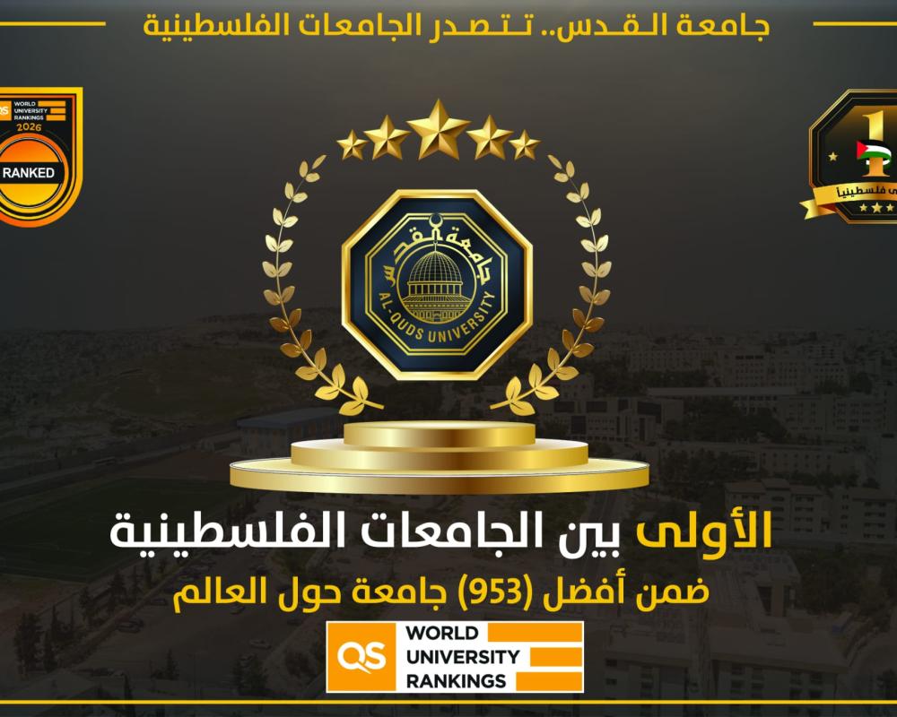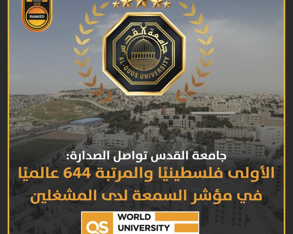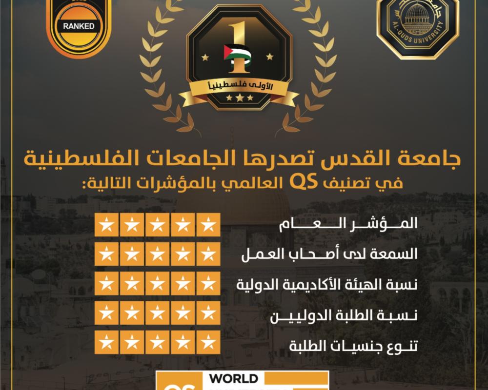 وقد حافظت جامعة القدس على المركز الأول في فلسطين من بين أربع جامعات فلسطينية تم تصنيفها عالميًا، وهو دليل على الريادة الوطنية المستمرة للجامعة في مجالات التعليم العالي، وهو إنجاز يدل على استمرارية التحسين والتخطيط بعيد المدى، ويعزز ثقة المجتمع الأكاديمي المحلي والدولي بالجامعة.