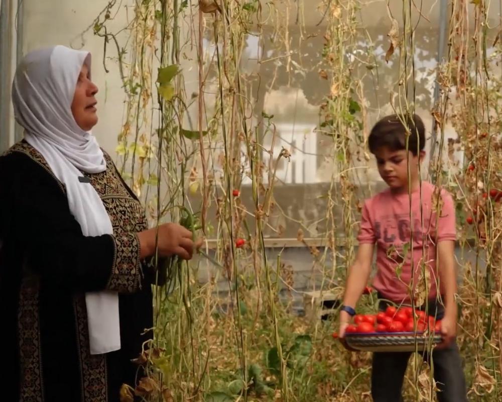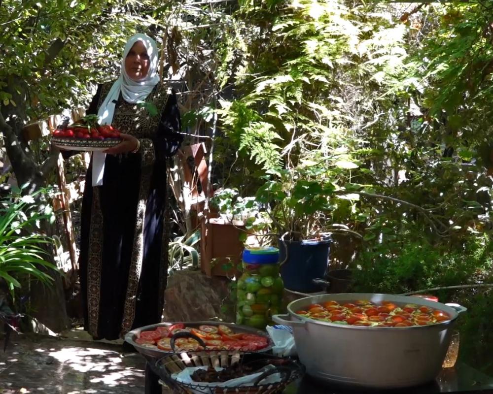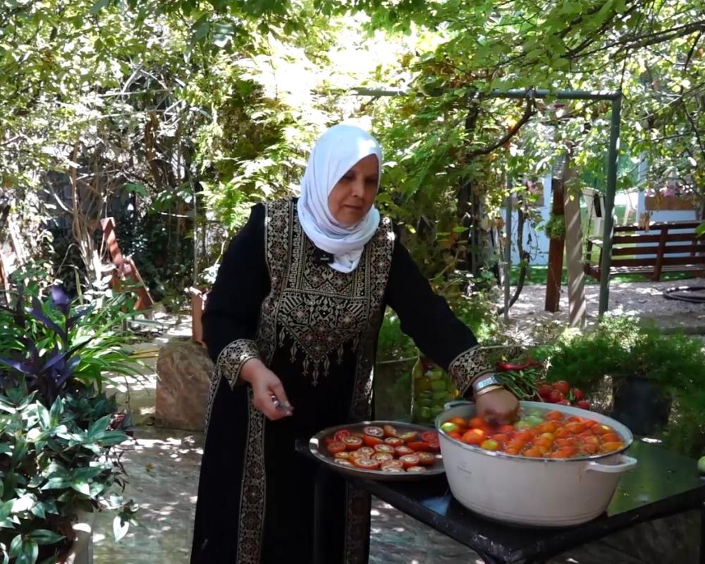 فاطمة مشارقة مزارعة من بلدة دورا جنوب الخليل عملت منذ سنوات على فلاحة أرضها وزراعتها بالمحاصيل الزراعية التي تحتاجها العائلة مكتفية ذاتيا بما تنتجه الأرض ، تزرع في بيت بلاستيكي نبات البندورة الذي اعتادت منذ سنوات طويلة على زراعتها وتخزينها فمنذ كان والديها يعملان على زراعة و تخزين وحفظ المنتجات الزراعية المحلية بطرق بيتية مثل العنب والزيتون والألبان ومنتجاتها وكذلك البندورة،