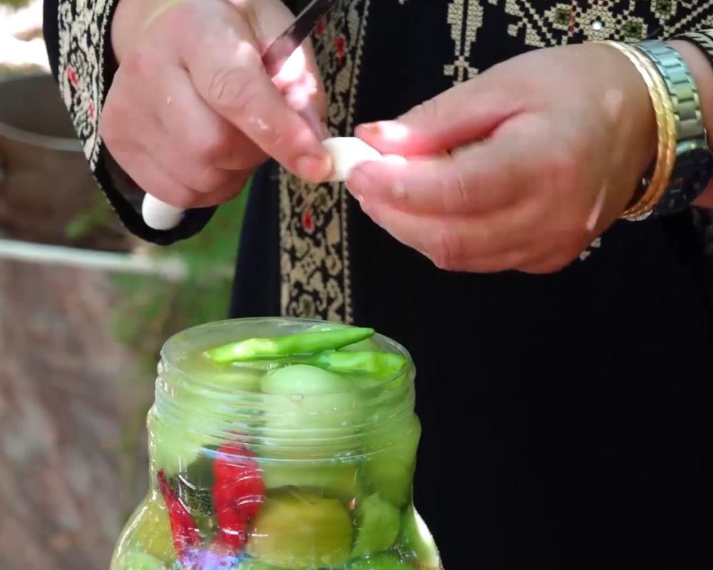 تعلمت مفاطمة مشارقة من والدتها طرق تخزين البندورة وحفظها لإعادة استخدامها في أي وقت تحتاجه لإعداد أصناف متنوعة من الطعام .ولازالت تصنعها بطريقة أمها ،فهي لا تتعب من ذلك بل تجد متعةأثناء عملها ، فهي تقوم بجمع ثمار البندورة من البيت البلاستيكي الذي تملكه العائلة بجوار منزلها ،وتقوم بغسلها بعد تقميعها ثم تقوم بفرزها إلى حبات حمراء ناضجة، أو إلى حبات خضراء تصنعه منها المخلل، وإلى حبات غير ناضجة تضعها على جنب .