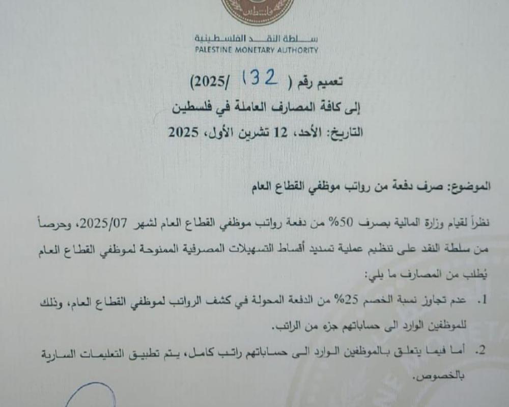 وكانت سلطة النقد قد أصدرت، اليوم الأحد، تعليمات لكافة المصارف العاملة في فلسطين، تزامناً مع صرف وزارة المالية نصف دفعة رواتب موظفي القطاع العام لشهر يوليو 2025.