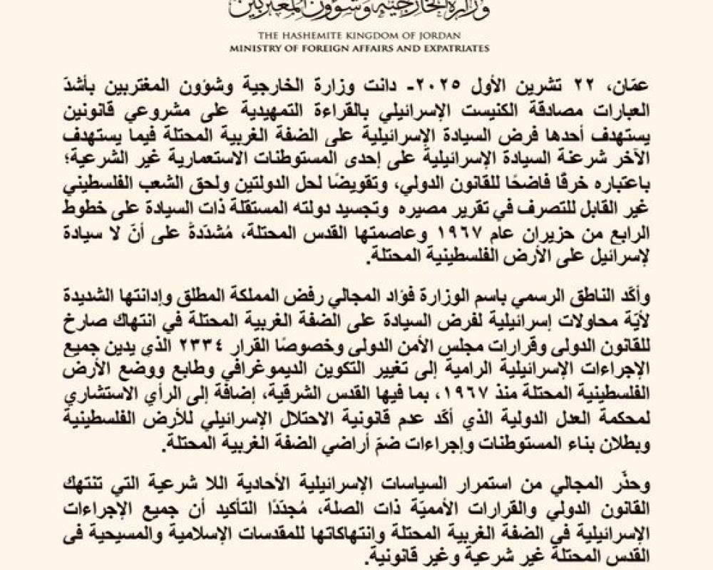 ودعا الأردن المجتمع الدولي إلى تحمّل مسؤولياته القانونية والأخلاقية تجاه حماية الشعب الفلسطيني ووقف محاولات فرض الأمر الواقع بالقوة، مشدداً على أن استمرار الاحتلال والاستيطان يهدد فرص تحقيق السلام العادل والشامل في المنطقة.