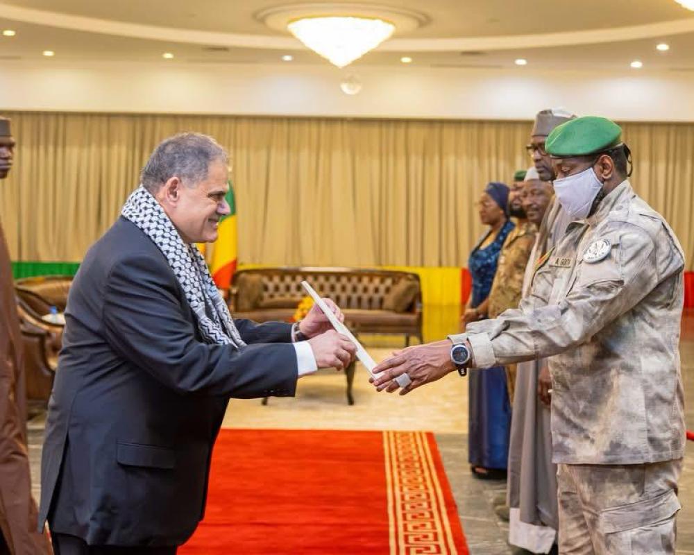 باماكو /PNN/ تسلّم رئيس الفترة الانتقالية لجمهورية مالي جنرال الجيش آسيمي غويتا، اليوم الخميس، أوراق اعتماد سفير مفوض فوق العادة لدولة فلسطين المعتمد لدى جمهورية مالي حسان البلعاوي، وذلك خلال مراسم رسمية.